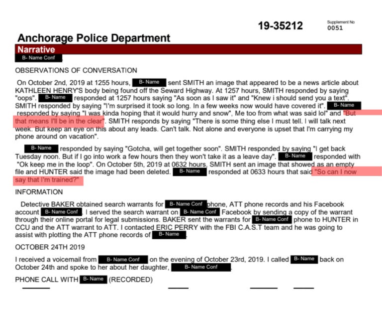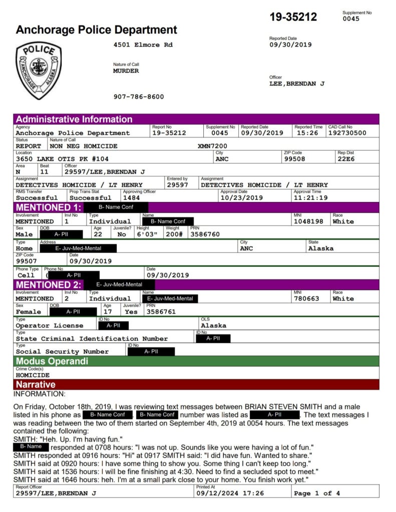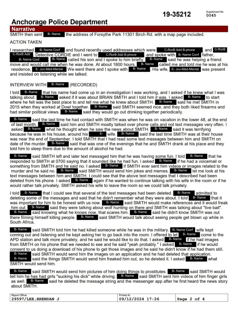 On October 18, 2019, Detectives Brendan Lee and David Cordie questioned Ian Calhoun about his association with Brian Steven Smith. The interrogation was conducted in two parts: At Calhoun’s home and later at the Anchorage Police Department station.